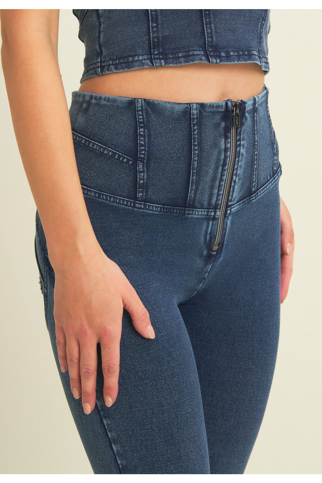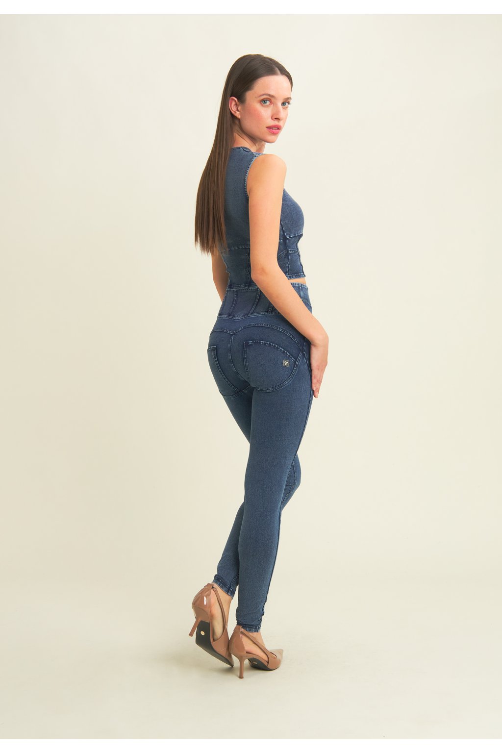 Materialul denim jersey elastic în patru direcții este moale, confortabil și se adaptează natural mișcărilor tale. În plus, este o alegere sustenabilă, realizată din bumbac organic și elastan reciclat, fără substanțe chimice și coloranți toxici. Tehnologia brevetată WR.UP® de la Freddy modelează și ridică silueta, în timp ce cusătura centrală alungește vizual picioarele.