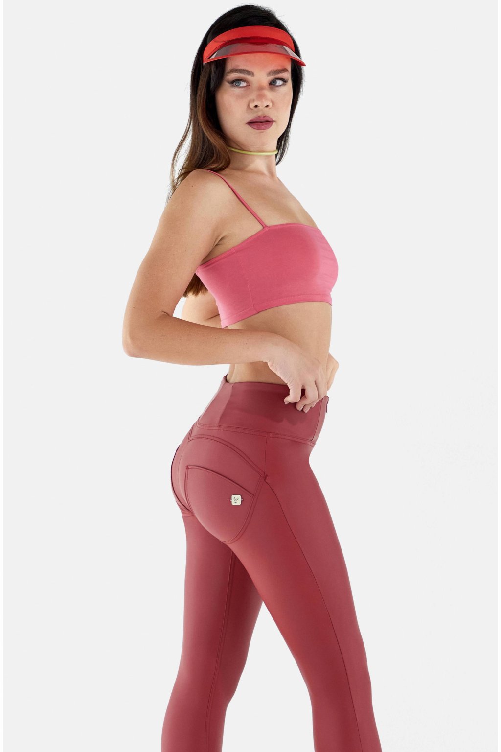 Pantaloni push-up din gama WR.UP®, din piele artificială ecologică elastică din materiale reciclate, perfecți pentru a-ți înfrumuseța fiecare moment al zilei, fără a renunța la libertatea de mișcare. Modelul are talie înaltă cu închidere cu fermoar în față, lungime clasică și croială skinny .Formele corpului, evidențiate de talia înaltă care sculptează talia și de croiala skinny, sunt puse în valoare de efectul modelator al tehnologiei WR.UP® patentată de Freddy, care îmbunătățește silueta datorită unui sistem special de inserții și cusături care evidențiază formele.